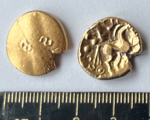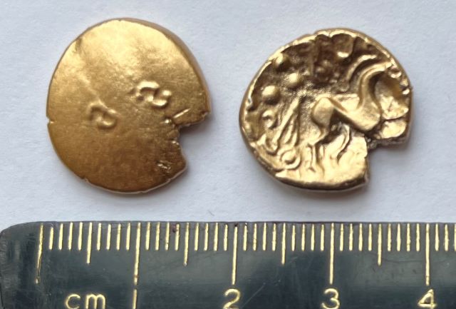 Uninscribed (mid to late 1st Century BC), gold Stater, North Thames Group, reversed SS on obverse, rev. horse facing right, various symbols around the horse and very rare. Big chunk out of coin but it is still a very rare coin.