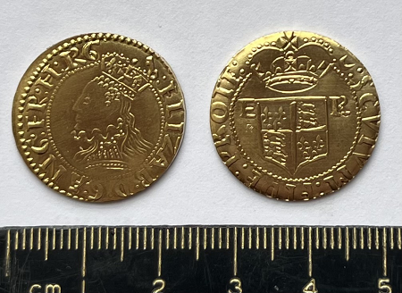 No 8 Elizabeth I Gold Crown made from NuGold. NuGold is a very nice gold looking alloy made from Copper and Zinc. This makes reproduction gold coloured coins cheaper because the price of gold plate is going sky-high. Here's the details on the coin.