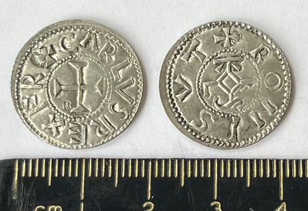 Charlemagne Silver Denier or Penny dating to 768-814 AD. The Obverse legend reads: CARLVSREXFR (CARLVS REX FR)The reverse legend reads: RONISVT which is a corruption of the mint name REDONNIS which is the mint town of Rennes.
