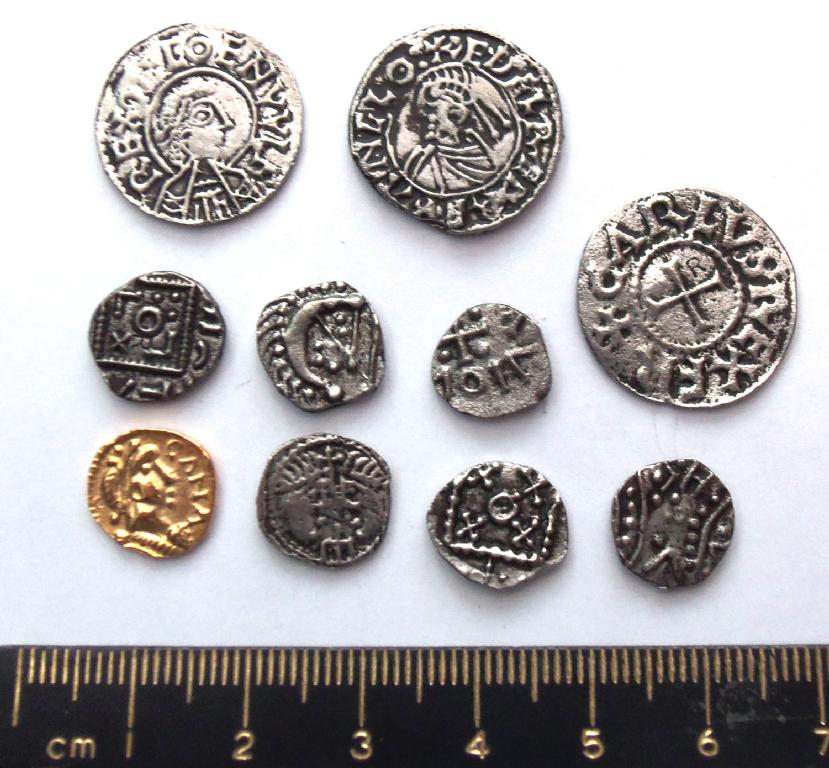 Saxon Coin Set comprising 1 Saxon gold tremissis or thrymsa, 6 early Saxon sceats and 3 late Saxon pennies.