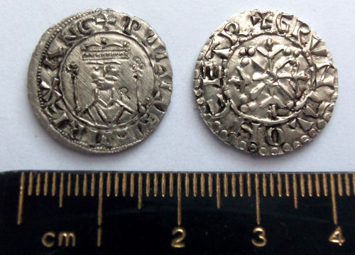 This is a William I Two Sceptres Type penny struck by GRVNAL ON CETR Chester and representing a coin dating to 1072 - 1074.