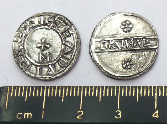 Made from a modern die cut by a master craftsman to represent this type and hand struck from pewter. The die maker has used the name Grunal as the moneyer on the coin.