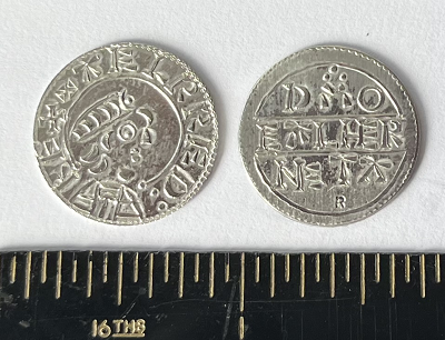 Alfred the Great "Lunette" Type Penny. One of his earliest coins, minted in Canterbury, England.Obverse shows Alfred facing right with legend "AELRRED REX"Reverse shows "DMO EALHER NETA" It shows the Moneyer Ealhere at Canterbury.