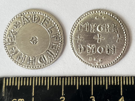 Reverse Legend reads in two lines: "MEGRE DMON" Meaning Megred the Moneyer