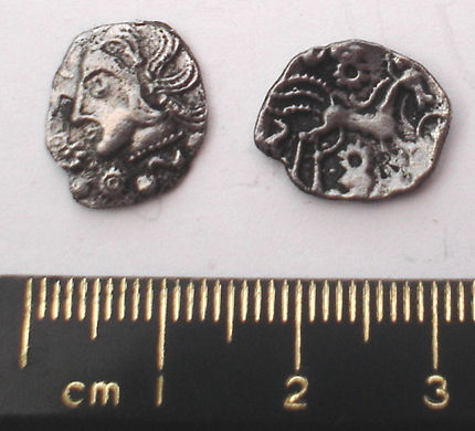 The coin is dated to c50BC, and is 14mm in size. It shows a beardless head facing left, with staring ringed-pellet eye, two pin mouth, coxcomb hair composed of four curved locks of beaded lines in triple bands and wearing beaded neck torc, cock’s head and reversed-S in front, serrated ‘sunburst’, pellets and reversed-S below.
