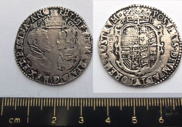 It is a shilling from the reign of Phillip and Mary 1554-1558. Large quantities of these shillings were minted during this period when, after an Act of Parliament pronouncing that a woman was unfit to rule alone, Mary reigned jointly with her husband Phillip of Spain. To indicate dual sovereignty ad boost Phillip’s popularity, both their busts are found on these coins. All issues were struck at the tower mint and many were dated as this example is ie. 1555.