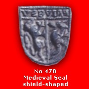 The beast on the right-hand side is a lion in the rampant position; this is, in fact, the same position as segreant is with the wyvern (compare the position of the upper limbs), but different terms are used for the two beasts. Unlike the wyvern, the lion is extremely common in heraldry, particularly the lion rampant, and without either information as to the colour of the lion and its background (which can be portrayed on seals by fine hatched lines which represent colours depending on their direction) or an exact find location, it is impossible to even hazard a guess as to the wife's family. As the piece was found near Oxford, however, it does raise one interesting possibility; there is a record of the Tame family of Oxfordshire using argent a wyvern (sometimes a dragon) vert combating with a lion rampant azure crowned or many years later. Although these are not the identical arms they have sufficient in common with the matrix to suggest that they may be related.